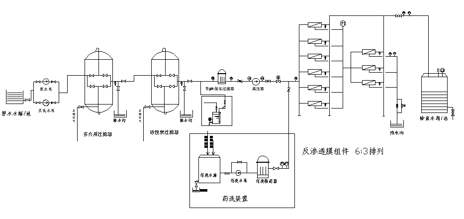 50m3/h单级反渗透设备适用食品、医药、化工、电子、玻璃、印染企业的生产工艺用水、电厂化水处理、锅炉用水等。一般以地下水做为水源,根据原水水质情况,以系统运行可靠、经济合理为原则,采用相关设计标准和规范,结合我公司多年工程经验,选定该系统的常规流程如下。地下水→原水箱/池→增压泵→多介质过滤器→活性炭过滤器→阻垢剂投加装置→保安过滤器→反渗透高压泵→反渗透装置→成品水箱/池。1.1 适合水源:地下水、自来水、达到生活用水水质的水源。1.2 进水水质:含盐量≤1500PPM(如超过此数据,请另加以说明)2.2 供电系统: 380v/50hz,220v/50hz, 2.5 场地要求:厂房高度≥5m,地面平整,可承重;室内设有排水沟及通风装置。电机采用自动/手动两种操作方式。集控操作在 PLC 柜统一进行,控制由 PLC实现。泵的联锁及备用、自投加待均由 PLC 实现。接地:根据有关规程、规范、所有需要保护接地的电气设备均可靠接入相应的接地系统。主要包括配电装置、PLC装置、机电设备、控制盘柜等。为预处理系统的正常运行提供流量及压力。参数:Q=70m3/h H=38m P=15KW为过滤器反洗提供流量及压力。参数:Q=250m3/h H=30m P=37KW多介质过滤器选用多种规格的滤料为填料,其填料具有较强的机械度与吸附性.主要是截留水中的悬浮物、泥沙、胶体、腐殖质等,也可通过加入一定量的锰砂以降低铁、锰离子的含量,当过滤器运行一段时间滤料过滤能力达到饱和时可通过定时手动(或自动)反洗--正洗来恢复其性能,反洗采用大流量水洗和气洗相结合的方式,以保证清洗效果;设计工作流速为10m/h。活性炭过滤器作用是进一步将悬浮物、胶体机械拦截通过清洗去除,对微生物、有机物进行吸附、分离去除,同时可吸附色与味;当过滤器运行一段时间滤料过滤能力达到饱和时可通过定时手动(或自动)反洗--正洗来恢复其性能,反洗可通入一定量的压缩空气(即气洗),以保证清洗效果;设计工作流速为10m/h。反渗透膜脱盐设备是使原达到溶解固形物浓缩排放和淡水的利用装置,根据原水水质分析报告,为了防止浓水端,特别是RO压力容器中最后一组膜元件的浓水侧出现诸如CaC03、CaC04浓度积大于其平衡溶解度指数而结晶析出,从而损坏膜元件的应用特性,因此在进入膜元件之前设置了阻垢剂投加装置。阻垢剂是一种有机化合物质,除了能在朗格利尔指数(LSI)=2.8情况下运行之外,还能阻止SO42-盐的结垢,它的主要作用是相对增加水中结垢物质的溶解性,以防止碳酸钙、硫酸钙等物质对膜的阻碍,同时它也可以降低铁离子堵塞膜的微孔。主要包括1台意大利/SEKO公司生产的计量泵和1只溶液箱。加药箱的容积能满足系统运行时1天的药品耗量。是进入反渗透膜组件前的最后一道保护装置,主要用于过滤在多介质过滤器、活性炭过滤器等过滤、吸附及截留等过程中,由于摩擦可能产生的细小微粒。反渗透装置是本套水处理系统的心脏部分,设计成熟合理与否不仅直接决定RO系统能否达到设计要求,而且关系到RO膜的使用寿命;经RO装置处理的水,能去除绝大部分无机盐和几乎全部的有机物、微生物。RO装置在水质分离过程中没有相变,脱盐率、水回收利用率高,设备体积小,PLC自动控制运行,适应性强,无环境污染等优点,我公司生产的反渗透装置均以进口名牌元件为,主机设有各种仪器、仪表、压力保护装置、保护冲洗装置,这些可保证系统产水量及系统稳定运行达到三年以上。RO膜:海德能公司CPA3 共54支,一壳六芯,6:3方式排列,压力容器(膜外壳) 哈尔滨乐普(设计压力300PSI)反渗透运行压力一般在1.3-1.8MPa,在反渗透膜组长期运行后,会受到某些难以冲洗掉的污染,如长期的微量盐份结垢和有机物的积累而造成膜组件性能的下降,运行压力升高,所以必须用化学药品进行清洗,以恢复其正常的除盐和制水能力。一般情况下,每2-4个月清洗一次,每次清洗约1-2小时。当出现下列污染特征时,需对RO膜进行化学清洗,恢复其性能,延长使用寿命。B、为了维持正常的产品水流量,经温度校正后的给水压力增加了10-15%;C、产品水水质降低了10-15%,盐透过率增加了10-15%; 反渗透清洗装置主要包括:清洗水泵、清洗水箱、清洗精滤器及配置仪表。用于储存反渗透产品水,其容积能满足系统1小时产水量的要求并设有液位器指示,液位自动开关。