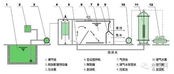 溶气气浮工艺原理解析处理过的部分废水循环流入溶气罐,在加压空气状态下,空气过饱和溶解,然后在气浮池的入口处与加入絮凝剂的原水混合,由于压力减小,过饱和的空气释放出来,形成了微小气泡,迅速附着在悬浮物上,将它提升至气浮池的表面。从而形成了很容易去除的污泥浮层,较重的固体物质沉淀在池底,也被去除。 适用于净化色度高,溶解氧低,有机杂质多的污水,对水温偏低,不宜用重力沉降的污水 净化尤为有效。此工艺适用于印染、电镀、制革、造纸、化工、纺织、肉类加工、炼油、罐头食品等生产后的工业废水处理及生产用水处理,也适宜于生物处理中生物泥膜与水的分离。 工艺流程 1、在加压条件下,空气的溶解度大,供气浮用的气泡数量多,能够确保气浮效果; 2、溶入的气体经骤然减压释放,产生的气泡不仅微细、粒度均匀、密集度大、而且上浮稳定,对液体扰动微小,因此特别适用于对疏松絮凝体、细小颗粒的固液分离; 3、工艺过程及设备比较简单,便于管理、维护; 特别是部分回流式,处理效果显著、稳定,并能较大地节约能耗。 |