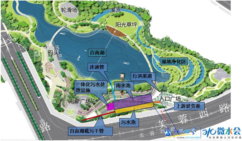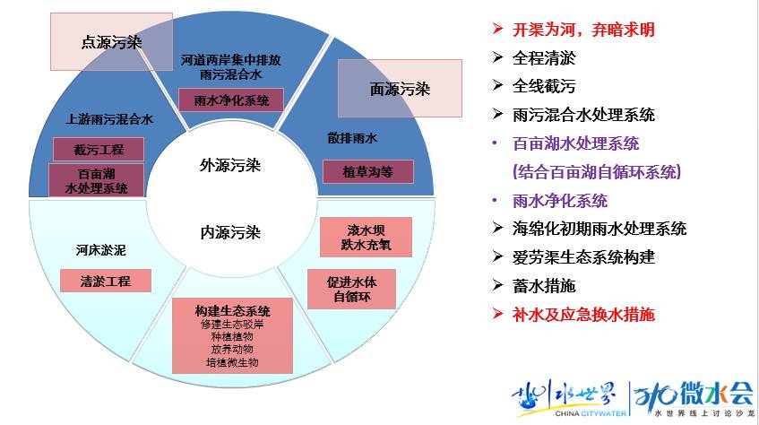 从点源污染和面源污染上进行治理,并配合其他措施予以恢复水体功能,提升水体景观。 措施&成效: A、实施河道清淤工程,清淤量45万m3;河道梳理2680m; B、实施截污工程,采用截留式合流制排水体制; C、建设百亩湖水处理系统,规模1.0万m3/d; D、新建雨水净化系统,总占地1470m2,采用自然生态湿地处理模式; E、河道湿地3600m2;下游湿地系统,总占地7660m2; F、修建拦水坝;新建补水及应急换水工程。 微水会结语: 黑臭水体治理作为一项系统性工程,控源截污是根本,而在治理过程中,具体问题具体分析,强化“一河一策”技术要求,强化顶层设计,建立长效保障措施,多管齐下。但就目前而言,由于黑臭水整治涉及的领域及部门较多,技术方案仍待完善,资金需求较大,故在技术、资金及商业模式等方面仍面临挑战。 (本文基于湘潭市规划建筑设计院景观与城市设计所所长马南董在第十一届城市发展与规划大会演讲ppt整理,未经专家审阅,观点仅供参考学习。) |