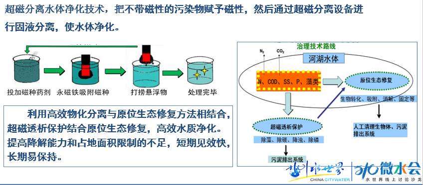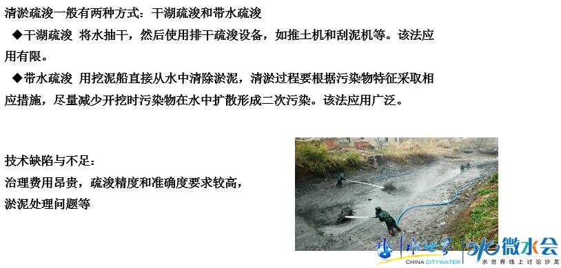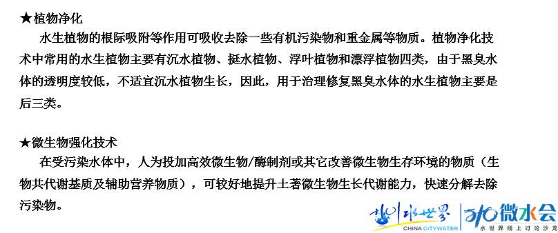 【干货速递】黑臭水体综合治理技术思路概述及案例分享从2014年“水十条”正式发布,城市黑臭水体整治被提上日程;2015年9月,住建部与环保部联合发布《黑臭水体整治工作指南》,黑臭水体治理攻坚战打响。各地亦在为消除“黑臭”制定行动计划,力争在规定时限内还城市水清净。 我国黑臭水体数量多,成因复杂,针对其治理技术以“控源截污、内源治理”为基础前提,目前主要采用的有化学法、物理法及生物—生态法。现微水会小编就黑臭水体治理常用技术及新技术,辅以治理案例做简要介绍,供大家参考学习。 整理编辑:冯茹; 接下去的几周我们将陆续带来本次规划会与水相关内容,敬请关注。 黑臭水体综合治理技术概述及案例分享 一、我国黑臭水体基本情况 1、现状 就目前来看,我国黑臭水体污染形势严峻,在全国295座地级及以上城市中,有超过七成的城市存在黑臭水体,黑臭水体总数1861个。 2、成因 造成水体黑臭主要是水体缺氧导致,同时也与水体富营养化和底泥沉积有关。概括来讲,有以下三点: 1)外源有机物和氨氮的耗氧; 2)内源底泥的释放污染; 3)水体流动性变差和水温升高。 二、黑臭水体治理思路 1、治理技术发展历程及技术路线 城市河道的黑臭治理要遵循“外源减排、内源清淤、清水补给、水质净化、生态恢复”的技术路线。其中控源截污和内源治理是选择其他技术类型的基础与前提。
