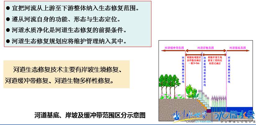 岸坡带植被在选择时要遵循生态学、景观性及亲水性三大原则,且要注意不同水生植物的栽种水深和栽种时间,保证水生植物的生长状态。 (2)河道生态多样性修复技术 包括水生植物和水生动物群落多样性修复技术两种。 a、水生植物群落多样性修复技术 b、水生动物群落多样性修复技术 5)治理新技术 (1)超磁透析保护+原位生态修复 (2)超磁分离+组装式接触氧化 (3)SMBR分散点源一元化处理技术 (4)微生物菌剂 (5)粉绿狐尾藻+底层微曝气技术 (6)高效生态浮岛工艺 三、案例解析——湘潭爱劳渠 1、现状 爱劳渠全长约6公里,始建初期是一条灌溉、排涝的主渠道。水质属劣V类水质,黑臭水体,且存在重金属含量超标现象。存在的主要问题有:截污不彻底、截污功能丧失,农业、家禽养殖污染,垃圾污染,渠道淤积,内源性污染物释放,无补充水源。此外,渠道自身及养护方面也存在缺陷和安全隐患。 2、方案设计及成果 思路:应着眼于构建生态基础设施,完善区域绿地系统格局;利用多湿地方式促进城市水资源循环利用,构建完善的自然雨水收集和净化系统;通过反规划手法打造城市生态本底,优化用地模式。