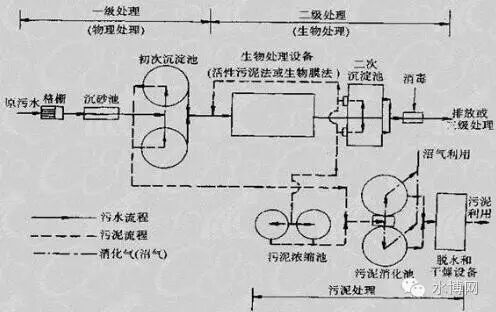 整个过程为通过粗格删的原污水经过污水提升泵提升后,经过格删或者筛率器,之后进入沉砂池,经过砂水分离的污水进入初次沉淀池,以上为一级处理(即物理处理),初沉池的出水进入生物处理设备,有活性污泥法和生物膜法,(其中活性污泥法的反应器有曝气池,氧化沟等,生物膜法包括生物滤池、生物转盘、生物接触氧化法和生物流化床),生物处理设备的出水进入二次沉淀池,二沉池的出水经过消毒排放或者进入三级处理,一级处理结束到此为二级处理,三级处理包括生物脱氮除磷法,混凝沉淀法,砂滤法,活性炭吸附法,离子交换法和电渗析法。二沉池的污泥一部分回流至初次沉淀池或者生物处理设备,一部分进入污泥浓缩池,之后进入污泥消化池,经过脱水和干燥设备后,污泥被最后利用。