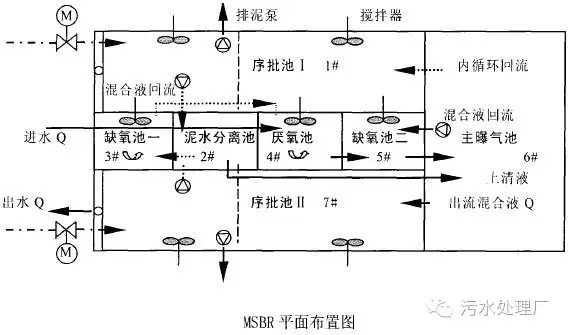 MSBR工艺总结MSBR(Modified Sequencing Batch Reactor)指的是改良式序列间歇反应器,是C.Q.Yang等人根据SBR技术特点,结合传统活性污泥法技术,研究开发的一种更为理想的污水处理系统。MSBR既不需要初沉池和二沉池,又能在反应器全充满并在恒定液位下连续进水运行。采用单池多格方式,结合了传统活性污泥法和SBR技术的优点。不但无需间断流量,还省去了多池工艺所需要的更多的连接管、泵和阀门。通过中试研究及生产性应用,证明MSBR法是一种经济有效、运行可靠、易于实现计算机控制的污水处理工艺。 特点 1.1 MSBR的基本组成 反应器由三个主要部分组成:曝气格和两个交替序批处理格。主曝气格在整个运行周期过程中保持连续曝气,而每半个周期过程中,两个序批处理格交替分别作为SBR和澄清池。 1.2 MSBR的操作步骤 在每半个运行周期中,主曝气格连续曝气,序批处理格中的一个作为澄清池(相当于普通活性污泥法的二沉池作用),另一个序批处理格则进行以下一系列操作步骤。 步骤1:原水与循环液混合,进行缺氧搅拌。 在这半个周期的开始,原水进入序批处理格,与被控制回到主曝气格的回流液混合。在缺氧和丰富的硝化态氮条件下,序批处理格内的兼性反硝化菌利用硝酸盐和亚硝酸盐作为电子受体,以原水及内源呼吸所释放的有机碳作为碳源,进行无氧呼吸代谢。由于初期序批处理格内MLSS浓度高,硝化态氮浓度较高,因此碳源成为反硝化速率的限制条件。随着原水的加入,有机碳的浓度增加,提高了反硝化的速率。来自曝气格和序批格原有的硝态氮经反硝化得以去除。另外,该阶段运行也是序批处理格中较高浓度的污泥向曝气格回流的过程,以提高曝气格中的污泥浓度。 步骤2:部分原水和循环液混合,进行缺氧搅拌。 随着步骤1中原水的不断进入,序批处理格内有机物和氨氮的浓度逐渐增加。为阻止在序批处理格内有机物和氨氮的过分增加,原水分别流入序批处理格和主曝气格。使序批处理格内维持一个适当的有机碳水平,以利于反硝化的进行。混合液通过循环,继续使序批处理格原来积聚的MLSS向主曝气格内流动。 步骤3:序批格停止进原水,循环液继续缺氧搅拌。 此后中断进入序批处理格的原水。原水在剩下的操作中,直接进入主曝气格。这使得主曝气格降解大量有机碳,并减弱微生物的好氧内源呼吸。序批处理格利用循环液中残留的有机物作为电子供体,以硝化态氮作电子受体,继续进行缺氧反硝化。由于有机碳源的减少,缺氧内源呼吸的速率将提高。来自主曝气格的混合液具有较低的有机物和MLSS浓度。经循环,把序批处理格内的残余有机物和活性污泥推入主曝气格,在此进行曝气反应降解有机物,并维持物质平衡。 步骤4:曝气,并继续循环。 进行曝气,降低最初进水所残余的有机碳、有机氮和氨氮,以及来自主曝气格未被降解的有机物和内源呼吸释放的氨氮,并吹脱在前面缺氧阶段产生的截留在混合液中的氮气。连续的循环增加了主曝气格内的微生物量,同时进一步降低序批处理格中的悬浮固体,降低了MLSS浓度,有利于其在下半个周期中作为澄清池时,减少污泥量以提高沉淀池的效率。 步骤5:停止循环,延时曝气。 为进一步降低序批处理格内的有机物和氮浓度,减少剩余的氮气泡,采用延时曝气。这步是在没有循环,没有进出流量的隔离状态下进行。延时曝气使序批处理格中的BOD5和TKN达到处理的要求水平。 步骤6:静置沉淀。 延时曝气停止后,在隔离状态下,开始静置沉淀,使活性污泥与上清液有效分离,为下半个周期作为澄清池出水做准备。沉淀开始时,由于仍存在剩余的溶解氧,沉淀污泥中的硝化菌继续硝化残余的氨,而好氧微生物继续进行好氧内源呼吸。当混合液中氧减少到一定程度时,兼性菌开始利用硝化态氮作为电子受体进行缺氧内源呼吸,进行程度较低的反硝化作用。在整个半周期过程中,此时序批处理格中上清液的BOD、TKN、氨、硝酸盐、亚硝酸盐的浓度最低,悬浮固体总量也最少,因此该序批处理格在下半个周期作为沉淀池,其出水质量是可靠的。在这一步,可以从交替序批处理格中排放剩余污泥。 第二个半周期:步骤6的结束标志着处理运行的下半个循环操作开始。通过两个半周期,改变交替序批处理格的操作形式。第二个半周期与第一个半周期的6个操作步骤相同。 运行特点 (1)MSBR系统能进行不同配置的设计和运行,以达到不同的处理目的。 (2)每半个运行周期中,步骤的数量和每步骤所需的时间,取决于原水的特性和出水的要求。这里介绍了6个运行步骤,但所需总的步骤可以被系统设计者所选择。常常可以在实际运行中减少,以便使运行过程简单化。例如,步骤1和步骤2能通过延长步骤1和减少步骤2的时间来合并这两步为一步。增加步骤1的时间则增加序批处理格有机碳的量,这使得在不进原水的缺氧混合时间需要更长,以平衡步骤3。也可以增加步骤,进行更多的缺氧-好氧序批操作,来处理有机物和氨氮浓度更高的原水,以达到更低出水总氮的要求。 (3)在每半个循环中,原水大部分时间是进入主曝气格。接着是部分或全部污水进入作为SBR的序批处理格。在主曝气格中完成了大部分有机碳、有机氮和氨氮的氧化。另外,主曝气格在完全混合状态下连续曝气,创造了一个稳定的生物反应环境。这使得整个设备能承受冲击负荷的影响。 (4)从序批处理格到主