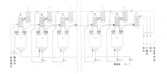 垂直管多效蒸发流程见下图: 垂直管多效蒸发技术流程 D-蒸发器;E-预热器;G一泵:K一冷凝器 含盐水首先进入冷凝器中预热、脱气,而后被分成两股物流。一股作为冷却水排回大海,另一股作为蒸馏过程的进料。 进料含盐水加入阻垢剂后被引入到蒸发器的后几效中。料液经喷嘴被均匀分布到蒸发器的顶排管上,然后沿顶排管以薄膜形式向下流动,部分水吸收管内冷凝蒸汽的潜热而蒸发。 二次蒸汽在下一效中冷凝成产品水,剩余料液由泵输送到蒸发器的下一个效组中,该组的操作温度比上一组略高,在新的效组中重复喷淋、蒸发、冷凝过程。剩余的料液由泵往高温效组输送,最后在温度最高的效组中以浓缩液的形式离开装置。 生蒸汽被输入到第一效的蒸发管内并在管内冷凝,管外含盐水产生与冷凝量基本等量的二次蒸汽。 由于第二效的操作压力要低于第一效,二次蒸汽在经过汽液分离器后,进入下一效传热管。蒸发、冷凝过程在各效重复,每效均产生基本等量的蒸馏水,最后一效的蒸汽在冷凝器中被含盐水冷凝。 第一效的冷凝液返回蒸汽发生器,其余效的冷凝液进入产品水罐,各效产品水罐相连。由于各效压力不同使产品水闪蒸,并将热量带回蒸发器。 这样,产品水呈阶梯状流动并被逐级闪蒸冷却,回收的热量可提高系统的总效率。被冷却的产品水由产品水泵输送到产品水储罐。这样生产出来的产品水是平均含盐量小于5mg/L的纯水。 浓盐水从第一效呈阶梯状流入一系列的浓盐水闪蒸罐中,过热的浓盐水被闪蒸以回收其热量。经过闪蒸冷却之后的浓盐水最后经浓盐水泵排回大海。不凝气在冷凝器富集,由真空泵抽出。 多效蒸发的工艺模式 多效蒸发工艺有以下几种工艺模式: (1)顺流工艺流程 溶液和蒸汽的流向相同,都由第一效顺序流到末效。原料液用泵送入到第一效,依靠效间压差,自流入(浓缩过程中要是有固体产生或溶液粘度较大就需要添加过料泵)下一效进行处理,完成液自末效用泵抽出。 后一效的压力低,溶液的沸点也相对较低,故溶液从前一效进入后一效时会因过热而自行蒸发,称为闪蒸。因而后一效有可能比前效产生较多的二次蒸汽,但因为后效的浓度比前效高,而操作温度又较低,所以后一效的传热系数比前一效要低,往往第一效的传热系数比末效高很多。 并流流程适宜处理在高浓度下为热敏性的物料。 顺流工艺流程