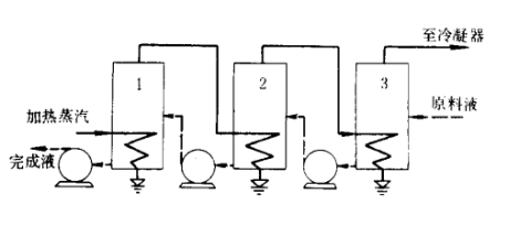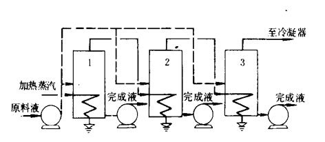 原料液由末效加入,用泵一次送到前一效,完成液由第一效放出,料液与蒸汽逆向流动。随着溶剂的蒸发、溶液浓度逐渐提高的同时,溶液的蒸发温度也逐效上升,因此各效溶液的浓度也比较接近,使各效的传热系数也相近。 但因为溶液从后一效输送到前一效时,料液温度低于送入效的沸点,有时需要补加加热,否则产生的二次蒸汽量将逐渐减少。一般来说,逆流加料流程适宜处理粘度随温度和浓度变化较大的物料,而不适宜处理热敏性的物料。 逆流加料工艺流程