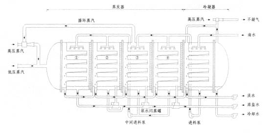 多效蒸发是使用最早的海水淡化技术,现今已经发展成为较为成熟的废水蒸发技术,解决了结垢严重的问题,逐步应用于高含盐水处理方向。 多效主要有如下几个方面的技术特点: 1.多效蒸发的传热过程是沸腾和冷凝换热,是双侧相变传热,因此传热系数很高。对于相同的温度范围,多效蒸发所用的传热面积要比多级闪蒸少。 2.多效蒸发的动力消耗少。由于多级闪蒸产生淡水依赖的是含盐水吸收的显热,而潜热远大于显热,因此生产同样多的淡水,多级闪蒸需要的循环量比多效蒸发大出很多,所以多级闪蒸需要更多的动力消耗。 3.多效蒸发的操作弹性很大,负荷范围从110%到40%,皆可正常操作,而且不会使造水比下降。