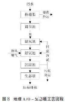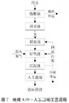 生活污水净化沼气池:新型生活污水厌氧净化池(或称城镇生活污水净化沼气池)是一种小型分散化污水处理装置。生活污水净化沼气池是在化粪池和沼气池的基础上发展起来的,解决了化粪池处理效果差、 沉积污泥多、沼气池沼气回收率低的弊端,其工艺流程见图5。 地下土壤渗滤系统:该系统将污水投配到土壤表面具有一定构造的渗滤沟中,污染物通过物理、化学、微生物的降解和植物的吸收利用得到处理和净化。工艺流程见图6。该种工艺技术是将污水有控制地投配到经一定构造、距地面约50 cm深和具有良好扩散性能的土层中,污水缓慢通过布水管周围的碎石和砂层,在土壤毛管作用下向附近土层中扩散,并利用土壤中的大量微生物,将污水中的污染物质过滤、吸附、降解。地下土壤渗滤净化系统建设容易、维护管理简单,基建投资少,运行费用低。整个处理装置放在地下,不损害景观,不产生臭气。但是负荷较低,不适合人口集中、污水产量较大的地区。 厌氧氨氧化工艺:厌氧氨氧化工艺是由荷兰Delft理工大学根据厌氧氨氧化原理研究开发的一种新型污水生物脱氮工艺。在此基础上发展出了多种生物脱氮工艺,如CANON、OLAND等。由于厌氧氨氧化过程是自养的,因此不需要另加COD来支持反硝化作用,与常规脱氮工艺相比可节约100%的碳源。而且如果把厌氧氨氧化过程与一个前置的硝化过程结合在一起,那么硝化过程只需要将部分NH4+氧化为NO2–N,这样的短程硝化可比全程硝化节省62.5%的供氧量和50%的耗碱量。 生物膜技术:生物膜法是分散生活污水处理主要应用的一种人工处理技术,包括厌氧和好氧生物膜两种。厌氧或好氧微生物附着在载体表面,形成生物膜来吸附、降解污水中的污染物,达到净化目的。这种方法设备简单、运行成本较低,处理效率高。反应器一般由填料、布水装置和排水系统三部分组成,采用的填料有无机类和有机类。目前,新型的生物膜反应器和固定化微生物技术也得到了广泛的研究。MBR(膜生物反应器)技术就是其中一种。也包括的生物 曝气生物滤池:简称BAF,是集生物膜法与活性污泥法两者优点于一身的第3代生物滤池。BAF具有去除有机物、有害物质、脱氮、除磷的作用;占地面积小、基建投资少、能耗及运行成本低。 双膜式太阳能技术:该种技术是运用生物膜和纤维膜的双模反应系统,运用鼓风机和抽水泵将阳光通过太阳能板进行转化,再经过系列运行,净化生活污水。适用于日照量充足的南方地区,污连续阴雨天则需要运用电进行运作。虽然这种技术较为新颖,但是在特定项目中已经有所使用,优势在于能够节约能源,并降低大量的运行费用。 地埋A/O-人工湿地技术:是在常规生化处理基础上增设人工湿地系统进行深度处理。人工湿地系统是人为的在有一定长宽比和底面坡度的洼地上用土壤和填料(如砾石等) 混合组成填料床,使污水在床体的填料缝隙中流动或在床体表面流动,并在床体表面种植性能好、成活率高、抗水性强、生长周期长、美观及具有经济价值的水生植物(如芦苇,蒲草和美人蕉等) ,形成一个“基质—微生物—植物”的复合生态系统,并利用这种复合生态系统独特的净化功能进行水质高效净化。适用于地势条件易于集水污水并能通过自流出水的且规模适中的村庄,处理规模20~200 t/天。工艺参数: 缺氧池停留时间不小于4 h,好氧池停留时间不小于6 h,污泥清理周期180 天,人工湿地水力负荷0. 5 ~1. 0 m3/(m2·d) ,工艺流程见图7。 地埋A/O-生态塘技术:一种常规生化处理后增加生态塘处理工艺。生态塘亦称氧化塘或稳定塘,是一种利用天然净化能力对污水进行处理的构筑物的总称。其净化过程与自然水体的自净过程相似,通常是将土地进行适当的人工修整,建成池塘,并设置围堤和防渗层,依靠塘内生长的微生物来处理污水。生物塘是以太阳能为初始能量,通过在塘中种植水生植物,进行水产和水禽养殖,形成人工生态系统,在太阳能(日光辐射提供能量) 作为初始能量的推动下,通过生物塘中多条食物链的物质迁移、转化和能量的逐级传递、转化,将进入塘中污水的有机污染物进行降解和转化,最后不仅去除了污染物,而且以水生植物和水产、水禽的形式作为资源回收,净化的污水也可作为再生资源予以回收再用,使污水处理与利用结合起来,实现污水处理资源化。该技术适用于拥有自然池塘或闲置沟渠,地势条件易于收集污水,并能通过自流出水的且规模适中的村庄,处理规模20~200t/天。工艺参数: 缺氧池停留时间不小于4 h,好氧池停留时间不小于6 h,生态塘停留时间不小于24 h,污泥清理周期180天,工艺流程见图8。 地埋A2/O-人工湿地技术:A2/O 工艺亦称A-A-O 工艺,本工艺为采用厌氧—缺氧—好氧法生物脱氮除磷工艺的简称,是流程最简单,应用最广泛的脱氮除磷工艺。适用于处理要求较高,四季气候变化大,气温较低的地区。处理规模不小于200 吨/天。工艺参数: 厌氧池停留时间不小于2 h,缺氧池停留时间不小于4 h,好氧池停留时间不小于6 h,人工湿地水力负荷0. 5~1. 0 m3/(m2·d) ,污泥理周期180 天,工艺流程见图9。 生物滴滤-人工湿地技术:亦称滴滤池工艺,一般以碎石或塑料制品为滤料,污水喷洒在滤层上部,沿滤料孔隙下渗时,有一部分污水、污染物和细菌附着在滤料表面上,微生物便在滤料表面大量繁殖,形成生物膜。污水中的有机污染物被生物膜中