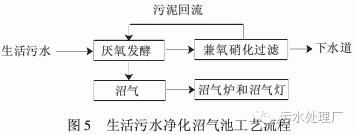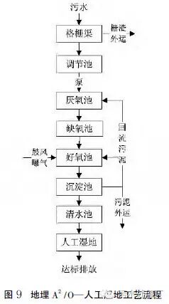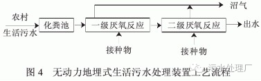 人工湿地:是利用人工水生态系统内多级生物的稀释降解作用来去除或削减水中污染物的方法。人工湿地作为一种新型生态污水处理技术具有投资和运行费用低、抗冲击负荷能力强、处理效果稳定、出水水质好、水生植物有一定经济价值等诸多优点。用于农村生活污水处理的主要是潜流人工湿地。人工湿地处理工艺流程图见图3。 无动力地埋式生活污水处理装置:生活污水首先进入厌氧消化池,污水中的悬浮物沉降下来成为污泥,污泥通过一定时间的自然发酵,有机物得到降解。工艺流程见图4。出水水质稳定达到国家二级排放标准。