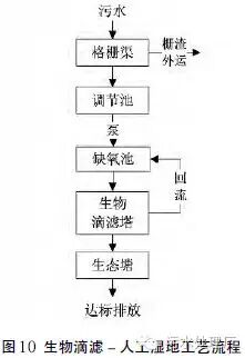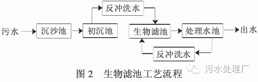 生物滤池:其最大的特点是集生物氧化和截留悬浮固体于一体,节省了后续沉淀池,厌氧水解—高负荷生物滤池处理系统集初沉池、曝气池、污泥回流设施以及供氧设施等于一身,大大简化了污水处理流程。生物滤池工艺流程见图2。
