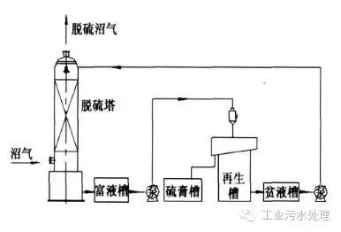 脱硫原理: Fe2O3 · H2O+ 3H2S = Fe2S3 + 4 H2O 再生原理: Fe2S3 + 3/2 O2+ 3 H2O = Fe2O3 ·H2O + 2 H2O+ 3 S 2. 湿法脱硫 湿法脱硫是将沼气送入洗涤塔,经碱性溶液洗涤吸收后流出,洗涤液进入富液槽、再生槽,通过使用化学药剂方法催化、氧化,最终将硫化物转化为单质硫(硫泡沫),吸收液可以再生循环使用。