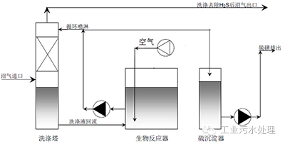 生物脱硫也是湿法脱硫的一种,与上述湿法脱硫的催化氧化工艺相比,最大区别是使用硫杆菌替代化学催化剂,将硫化物直接氧化成硫单质。 反应原理: H2S + OH-= HS- + H2O HS- + 1/2O2= So + OH- 工艺流程示意图如下: 二、常见沼气脱硫工艺比较