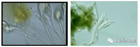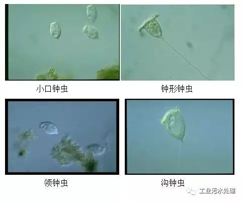 1. 钟虫 钟虫的虫体形似一个倒置的钟,尾柄内能观察到肌丝,能靠尾柄收缩虫体,没有分枝,常常单独固着在絮体或其他杂质上。钟虫的种类比较多,在活性污泥絮体中常见的有:钟形钟虫、沟钟虫、小口钟虫和领钟虫。